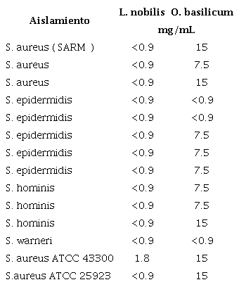 La tabla 3 muestra las CMI de los extractos de las plantas que presentaron actividad antimicrobiana frente al 100 % de los aislamientos de Staphylococcus. El extracto de L. nobilis tuvo una CMI menor a 0.9 mg/mL para todos los aislamientos, y para el extracto de O. basilicum se obtuvieron valores de CMI que oscilaron entre 0.9 y 15 mg/mL (tabla 3).