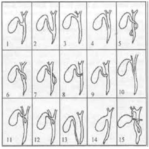 Para el presente estudio, encontramos dos casos de unión en espiral anterior y posterior, (3.2 °/o), que coincide con la opinión de Willians y Warwick, Stremple y Healy, quienes citan tres formas de unión hepatocística: angular, paralela y espiral 24-26.