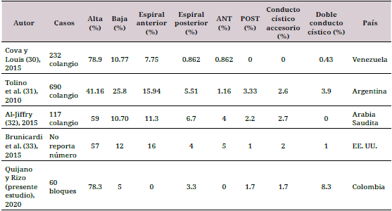 En cuanto a las características y el trayecto del conducto cístico, corresponde con lo reportado en otros estudios y en la literatura existente (tabla 3).