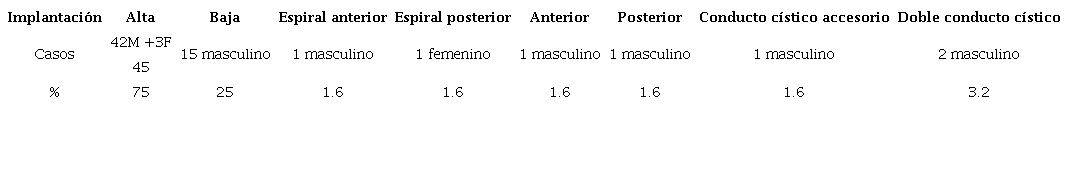 Resultados: siguiendo la clasificación de Taybi, se encontraron las variaciones: con implantación alta (75 %), baja (25 %), en espiral anterior (1.6 %), espiral posterior (1.6 °/o), conducto cístico accesorio (1.6 °%) y doble conducto cístico (3.2 °%). En cuanto a las dimensiones del conducto cístico, se evidenció una longitud promedio de 19.4 mm y un diámetro promedio de 3.3 mm. Las características anatómicas usuales fueron similares a las reportadas en la literatura.
