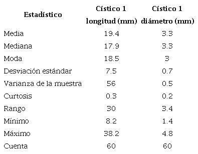 Se tomaron las medidas de longitud y diámetro. La longitud mínima fue de 8.2 mm, y la máxima, de 38.2 mm, con una media de 19.4 mm, que osciló con una desviación estándar (DE) ± 7.5 mm, con una curtosis tendiente a una distribución normal. En cuanto al diámetro, la medida mínima fue de 1.4 m, y la máxima, de 4.8 mm, con una media de 3.3 mm, una DE ± 0.7 mm y una curtosis hacia lo normal. Además, se encontró un solo bloque con un conducto posterior, con longitud de 17.8 mm y diámetro de 1.8 mm (tabla 2).