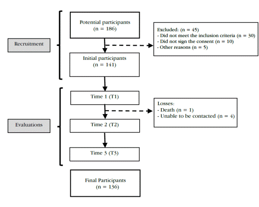 We used a correlational, longitudinal design for this study, with prospective follow-up, for descriptive and predictive purposes. We obtained the population and samples as described in Figure 1. In total, we recruited 186 patients, among whom 45 were excluded for not fulfilling the eligibility criteria, leaving 141 to participate in the first assessment period (T1). The final sample, with all three assessments, was composed of 136 patients, as 5 were lost between T1 and T2.