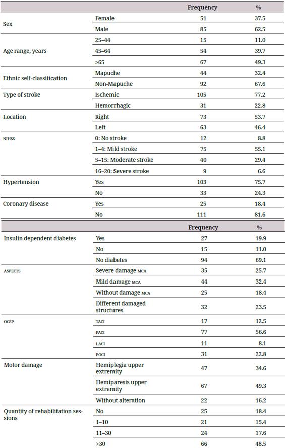 Table 1 presents the sociodemographic and clinical characteristics of the final sample, showing that 62.5 % of the participants were men, 49.3 % were aged 65 years or older, 76.5 °% lived in an urban area, and 32.4 °% self-classified as belonging to the Mapuche ethnic minority group. With regard to the extent and severity of the damaged brain area, 58.1 °% of the sample showed moderate to slight damage in the middle cerebral artery (mca; as measured by the Alberta Stroke Program Early ct Score [aspects]), and 56.6 °% showed a partial anterior circulation infarct (paci) according to the Oxfordshire Community Stroke Project (ocsp) classification.