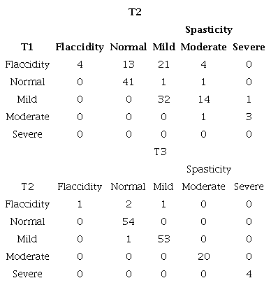 Table 2 presents the crossed distributions of muscle tone categories in the elbow, comparing T1 and T2 and comparing T2 and T3. For correct interpretation, it must be considered that although the cells of the downward diagonal (indicated with a border) include the patients who demonstrated maintained tone between assessment times, the cells above and below the diagonal indicate the patients who presented increased or reduced tone, respectively.