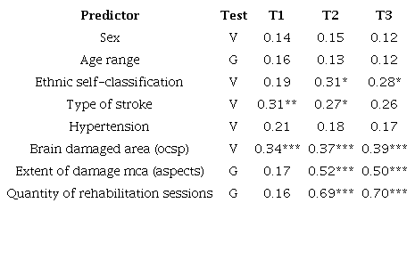 With the exception of hbp, all clinical variables significantly predicted elbow tone for at least two evaluation times (see Table 3). In addition, the damaged brain area (according to the ocsp) significantly predicted the muscle tone of the elbow (see Table 3). We also observed greater ischemic damage (according to ASPECT) at T2 and T3. Finally, a higher number of rehabilitation sessions predicted increased elbow tone (see Table 3).