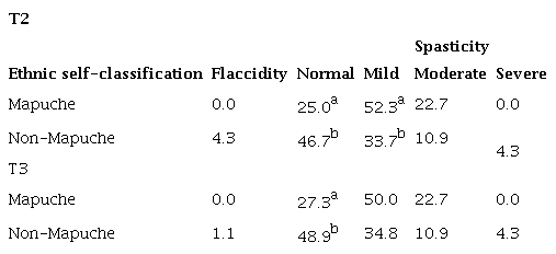 Ethnic self-classification (Mapuche or nonindigenous people) was the only sociodemographic variable that significantly predicted elbow tone at T2 and T3, indicating that, comparatively, nonindigenous patients tended to exhibit normal tone and Mapuche patients increased tone-specifically, slight spasticity. Although this finding is highly relevant, because it contributes new information in this area of study, possible explanations should be considered.