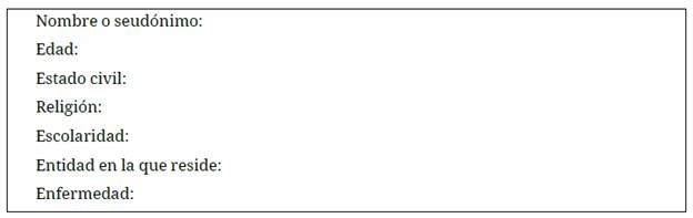 Objetivo: identificar cómo vive el padecimiento el enfermo. ¿Qué enfermedad crónica padeces? ¿En qué año fue diagnosticada? ¿Tienes problemas frecuentes por esta enfermedad? ¿Has tenido que ser hospitalizada? ¿Cada cuándo tienes que ser hospitalizada? ¿Cuentas con seguridad social? De no ser así ¿dónde te atiendes? ¿Cómo ha sido el trato que recibes en las instituciones de salud? ¿Cómo ha sido el trato que recibes por parte de los médicos, enfermeras, etc.? ¿Aproximadamente cuánto dinero gastas en el tratamiento de la enfermedad? ¿Has tenido problemas emocionales por padecer esta enfermedad? ¿Has pensado en la muerte?