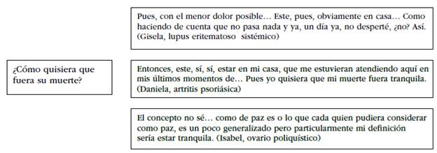 Por último, los discursos de las participantes coinciden en que desean que su muerte sea tranquila, sin dolor, en paz, en su casa con sus familiares, que coincide mucho con lo que consideran una muerte digna. Todas ellas, al padecer una enfermedad crónica, comparten significados de la muerte, interpretando que sus discursos se han elaborado a partir de sus experiencias de dolor y sufrimiento de la enfermedad crónica y de la interacción con sus familiares y los profesionales de la salud (figura 1).