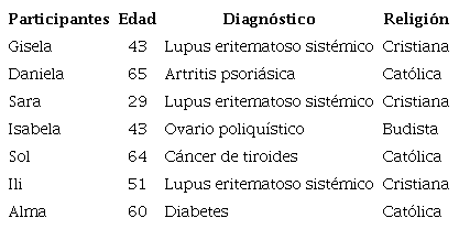 Se entrevistaron siete enfermas crónicas, cuyas edades fluctúan entre los 29 y los 65 años de edad, de diversas religiones y diagnósticos. Los criterios de selección fueron: ser mayor de edad y diagnóstico de una enfermedad crónica. Es importante resaltar que en dos casos los varones que serían entrevistados fallecieron, por lo que la muestra se conformó por mujeres; sin embargo, el objetivo del trabajo no está dirigido a un enfoque de género. Se utilizó el muestreo bola de nieve para contactar a los participantes 25. Es importante indicar que se cambiaron los nombres de las participantes por seudónimos para garantizar la confidencialidad (tabla 1).