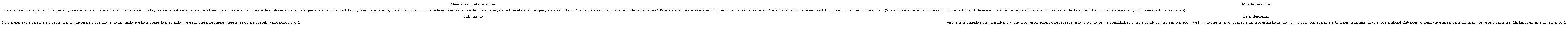 El discurso de las participantes es elaborado de forma convergente, al señalar que una muerte digna es aquella en la que no exista dolor, sufrimiento, que sea tranquila, sin miedo, que se pueda dejar descansar (tabla 2).