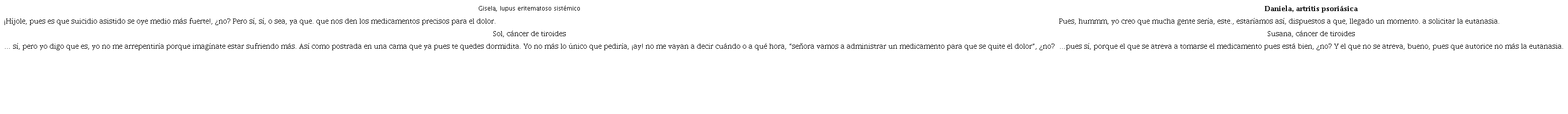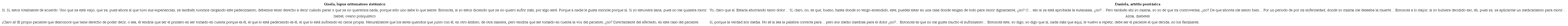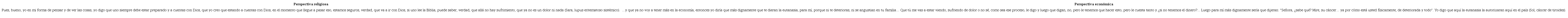 La posición discursiva de Sara está muy relacionada con la religión y está convencida de que una vez que uno muere, existe otro lugar en el que no hay dolor ni sufrimiento. El discurso de Sol está muy apegado a la solicitud de la eutanasia por toda su historia de vida, sus experiencias previas de muerte de seres queridos y por el desgaste que puede presentar, como lo indica, con el avance de la enfermedad. Algo relevante de su discurso es el aspecto económico, que si bien debe considerarse, no debe ser determinante para solicitar la muerte médicamente asistida, sino que deben de analizarse y considerarse otros elementos que causan sufrimiento tanto físico como existencial, como lo relata en su comentario.
