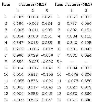 El AFE identificó un modelo de tres factores (ME1); sin embargo, los patrones de correlación entre los ítems sugirieron inconsistencias de la nueva escala. Los ítems 4 y 5 presentaron cargas factoriales cruzadas en dos factores (tabla 1). Además, se observó correlación alta (0.34-0.76) entre los ítems 7, 8 y 9 con ítems de otros factores (tabla 2). Así mismo, la correlación entre el factor 1 y 3 fue alta (p = 0.71), lo que indicó posibles problemas de dimensionalidad.