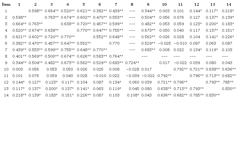 De acuerdo con los resultados de este estudio, la nueva versión de la escala presenta resultados diferentes al análisis psicométrico de la escala original de Andrade et al. 21. En primer lugar, en cuanto estructura, la escala se redujo de 3 a 2 factores y la cantidad de ítems disminuyó de 14 a 13. En cuanto al AFE y la consistencia interna de los ítems, en este estudio se obtuvieron mejores indicadores, dado que se encontraron cargas factoriales (0.70 y 0.94) y coeficientes de fiabilidad (>0.75) más altos en comparación con la escala original. Otro hallazgo importante fue que la varianza explicada de esta escala superó a la versión anterior, del 45.7 °% al 64.93 °%, en la nueva versión.