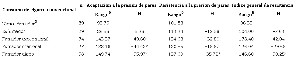 Resultados: El 63.3 % de los estudiantes fueron mujeres y la media de edad fue de 19.66 años. Se identificaron dos factores con un total de 13 ítems. Se obtuvo un alfa de Cronbach de 0.81. Se encontraron diferencias estadísticamente significativas entre los distintos tipos de consumidores de cigarro convencional y los puntajes de la escala de resistencia a la presión de pares (H[4] = 23.85; p < 0.001).