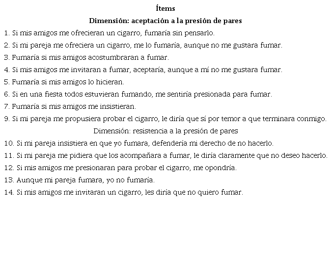 Con respecto a los factores identificados, la dimensión aceptación a la presión de pares se interpreta como la intención de corresponder o aceptar el ofrecimiento por parte de los pares al consumo de cigarro convencional. Dicho constructo concuerda con las preguntas que se incluyeron en esta dimensión. Por otro lado, la dimensión de resistencia a la presión de pares se refiere a la intención de ceder o resistir a la presión explícita ejercida por los pares para consumir cigarro convencional, dado que las preguntas de esta dimensión cuestionan si existe insistencia o presión para el consumo de cigarro convencional.