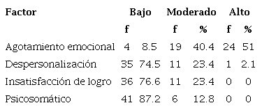 Conclusions: A high level of emotional exhaustion was evidenced among the medical residents in relation to the development of their activities, which were associated with problems in the management of impulses, distortions of reality (due to psychoticism), belonging to the first years of residency, and the lack of physical exercise. Hence, special attention must be given to the physical and mental health of medical residents.