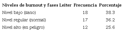 Se analizaron los datos de los 47 médicos residentes en la EDO por sus cuatro dimensiones (agotamiento emocional, despersonalización, insatisfacción de logro y psicosomático). Para obtener los puntajes de calificación se sumaron los ítems de cada dimensión, y una vez calculado el puntaje bruto, se realizó la conversión de un promedio individual a valores Leiter 27. Finalmente, con base en el valor alcanzado, se llegó a un diagnóstico en uno de los cuatro niveles y fases de desgaste profesional: nivel bajo (fase sano) suma de valor Leiter = 3; nivel regular (fase normal) suma de valor Leiter = 4; nivel alto (fase en peligro) suma de valor Leiter = 5 o 6, y nivel muy alto (fase "quemado") suma de valor Leiter = 7.