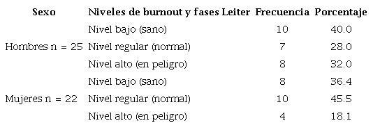 La tabla 3 muestra, agrupados por sexo, los niveles y las fases de burnout de acuerdo con la escala Leiter. Se puede observar que un 68 % de los hombres presenta un nivel de SB normal; mientras que un 32 % se encuentra en nivel alto, es decir, en peligro por dicho desgaste. Por otra parte, en las mujeres se puede observar a un 81.8 % con SB normal; no obstante, también se encuentra un 17.9 °% en nivel alto de SB, es decir, en peligro por dicho desgaste.