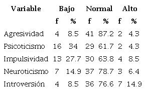 En la escala impulsividad, el 27.7 °% de la población presenta un nivel bajo, y ello indica que, tal vez, exista un comportamiento excesivamente reservado. No obstante, el 8.5 °% tuvo un nivel alto de impulsividad y señala, probablemente, diversas manifestaciones de conducta no reservada, son conductualmente desinhibidos, con involucramiento en conductas acting-out, actúan de manera impulsiva y buscan experiencias nuevas y excitantes.