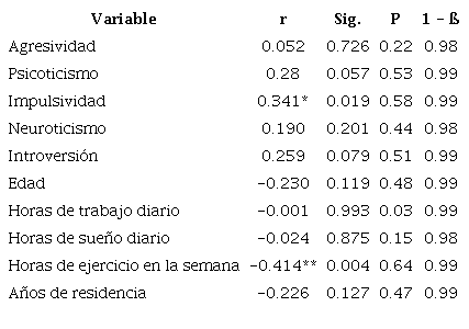 Los análisis de relación entre el nivel de sb y la personalidad, así como sociodemográfi-cas, muestran relaciones significativas con algunas variables. Como se puede observar en la tabla 5, el desgaste profesional de los médicos muestra una relación significativa y positiva con la impulsividad (r = 0.341, p = 0.019). Ello indica que a mayor impulsividad, el síndrome tiende a ser más elevado. También se encontró una relación significativa negativa con las horas de ejercicio en la semana (r = -0.414, p = 0.004), lo cual significa que a menor ejercicio físico, mayor será el burnout. Los tamaños del efecto en ambas variables son grandes y ello indica que la relación es importante y relevante (tabla 5).