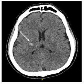 The stoke code was activated in the institution, and a simple skull CT scan was performed (Figure 1), which showed hyperintensity in the right basal ganglion region consistent with an acute hemorrhagic event in this area.