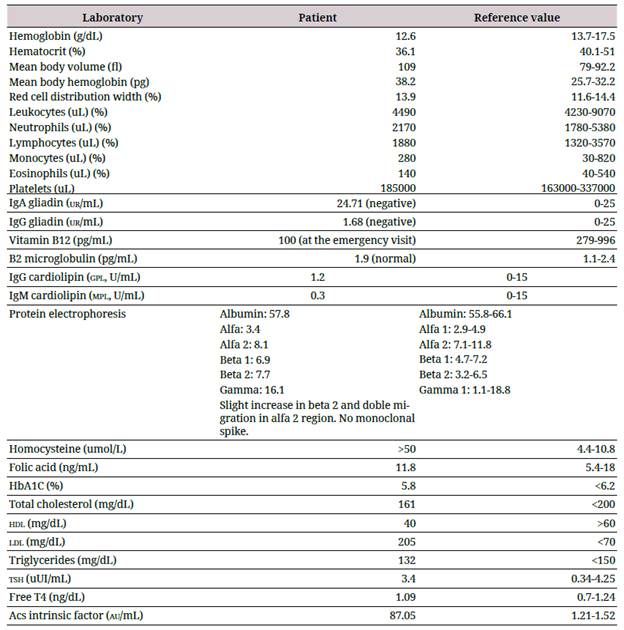 The patient was discharged after 3 days with indications for an outpatient follow-up at the internal medicine and neurology departments. During a neurology consultation, his vitamin B12 levels were evaluated due to the high prevalence of neuropsychiatric symptoms associated with vitamin B12 deficiency in our population. Therefore, it is common practice to routinely measure these levels from hospitalized patients as a preventive measure, even in the absence of symptoms. The serologic vitamin B12 levels were <100 pg/mL, and homocysteine testing was requested, which showed levels of >50 pg/mL. In this context, the supplementation was started, which gradually decreased the homocysteine levels. During follow-up, the patient did not present new neurological deficits. When malabsorption was considered a cause of vitamin B12 deficiency, celiac disease was ruled out, IgA and IgG anti-gliadin were negative, and a paraneoplastic compromise was excluded by normal protein electrophoresis. Finally, positive antibodies against intrinsic factors were found, suggesting that vitamin B12 deficiency was caused by pernicious anemia.