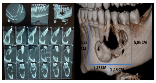 Con respecto a los antecedentes médicos personales, negó antecedentes de importancia. Refirió que un año atrás había presentado una lesión radiolúcida localizada en los órganos dentarios 34 y 35, detectada por su odontólogo general, quien lo remitió a un especialista del área de endodoncia. Por tal motivo, le realizaron la endodoncia de estos y le removieron la lesión, que no se envió a estudio patológico. Ocho meses después, comenzó a sentir sensibilidad en los órganos dentarios adyacentes, por lo que decidió consultar nuevamente odontología general, donde le solicitaron una tomografía Cone Beam. Esta evidenció una lesión hipodensa de mayor tamaño que las iniciales en la hemiarcada inferior izquierda. Se tomaron las medidas que involucran la lesión (figura 1).