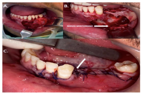 Quirúrgicamente, se procede bajo anestesia general a infiltración con lidocaína al 2 % + epinefrina en la hemiarcada inferior izquierda del nervio largo bucal, lingual e infiltrativa de Selding, para seguidamente llevar a cabo una incisión lineal festoneada con descargas mesiales y distales, junto con el levantamiento del colgajo mucoperióstico de espesor total. Se localiza la lesión quística (figura 3a), se procede con descompresión de esta, se continúa con exodoncia quirúrgica de los órganos dentarios 34 y 35, seguido de enucleación, decorticación/ curetaje óseo, desbridamiento y lavado profuso con solución salina al 0.9 %. Se rechaza el nervio mentoniano y se esqueletoniza para proteger su integridad (figura 3b). Se regularizan los rebordes óseos, para continuar con colocación de sonda Nelaton desde la luz del quiste hasta posicionarla en región lingual adyacente a 33 con sutura. Se procede con el cierre del colgajo con puntos simples de sutura, sutura continua y colchoneros con vycril 3.0 (figura 3c). Se finaliza el procedimiento, en el que se presentó una hemorragia del canal alveolar inferior, que se resuelve con cauterización.
