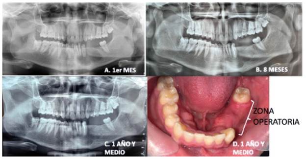 Por la evolución que ha presentado el paciente, sin sintomatologia ni recidiva de la lesión después de 23 meses de control y sin necesidad de haber usado la sc, dentro del plan de tratamiento se plantea extraerle los terceros molares y regenerar la zona con injerto en bloque y particulado para colocarle implantes en la zona posteroinferior izquierda, seguido de rehabilitación sobre estos. No obstante, por falta de sustento económico, no puede iniciar dicho tratamiento y se maneja con prótesis removible. Por todo ello, se puede decir que al día de hoy el paciente presenta una buena evolución; sin embargo, se sugiere darle al caso un seguimiento durante más de cinco años.
