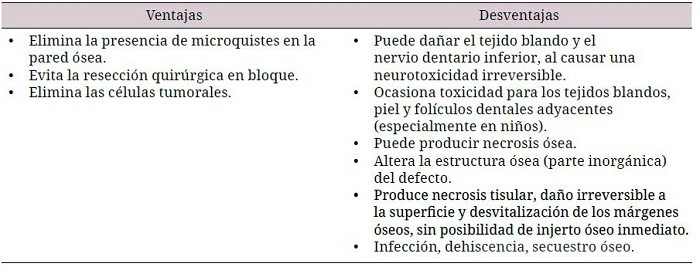 Sin embargo, en el momento de utilizar la SC, se debe tener precaución con los tejidos blandos, para evitar la necrosis y aumentar la morbilidad postoperatoria; además, puede causar déficits persistentes de la función neural, dependiendo de la duración de la exposición. Algunos autores indican que no es prudente el empleo de la sc como tratamiento adyuvante para el QR, por los riesgos para las estructuras adyacentes, como el tejido nervioso. Así mismo, se cree que existe la posibilidad de efectos carcinogénicos, debido a que contiene cloroformo. De esta manera, la sc es citotóxica para los queratinocitos 16. En la tabla 1 se reseñan las ventajas y desventajas de la sc 17,18.
