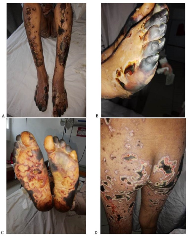 Figura 1. A), B), C) y D) Se observan máculas y ampollas en los miembros inferiores con extensas áreas necróticas asociadas con lesiones ulcerativas