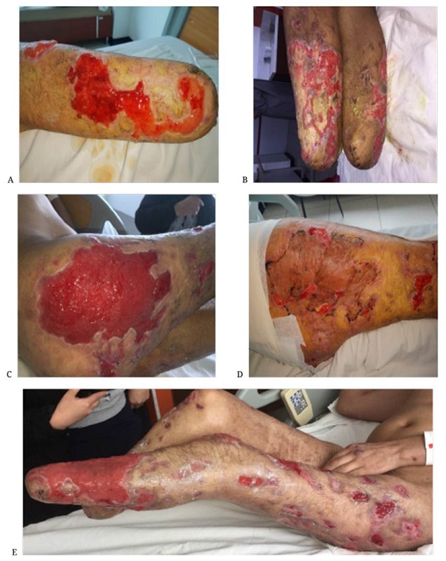 Figura 2. A), B), C), D) y E). Se observa amputación de los pies y las heridas en proceso de cicatrización y epitelización después de múltiples injertos realizados
