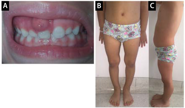 Fue evaluada a los 3 años y 6 meses por nefrología pediátrica, que en el examen físico encontró signos vitales normales para la edad; talla de 87 cm y peso de 12.24 kg, con antropometría alterada en relaciones de peso y talla para la edad (P/E: -2 de; T/E: -3 de). El perímetro cefálico fue de 50.5 cm (+1 de). No había dismorfismo facial, pero sí evidencia de dientes descalcificados y presencia de absceso dental en el cuadrante superior derecho (figura 1A), tórax en quilla, extremidades inferiores con evidente genu varo simétrico (20°) distancia intercondílea de 5 cm y ensanchamiento metafisario (figuras 1B y 1C).