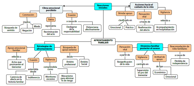 Resultados: El afrontamiento familiar muestra cómo las reacciones iniciales de las familias transitan sobre un fuerte componente emocional, al tiempo que emergen estrategias de afrontamiento como el apoyo emocional familiar, la búsqueda de apoyo externo, la vigilancia y la evasión. El afrontamiento familiar se ve favorecido por el acceso oportuno a servicios de salud, lo que muestra que no se reduce a mecanismos internos. La dinámica familiar posterior suele centrarse en una práctica de cuidado y reacomodación de roles.