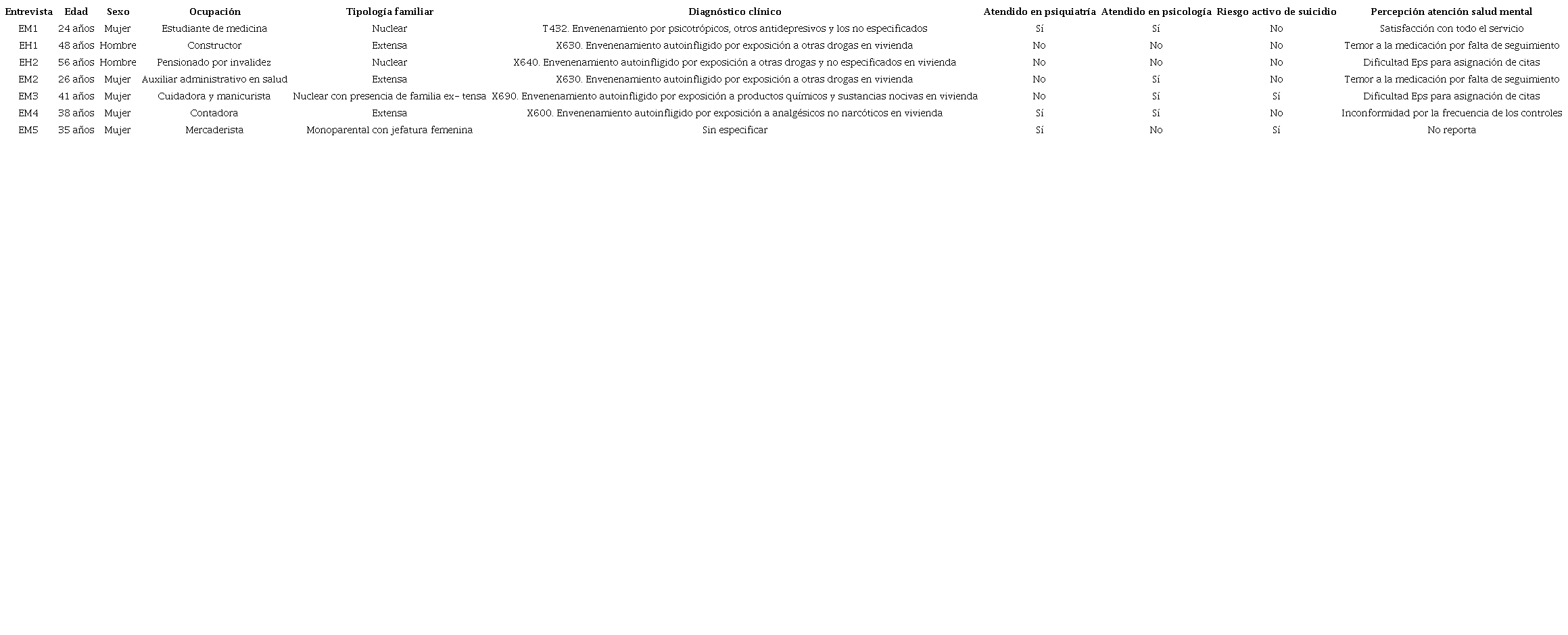 Los participantes de la investigación corresponden a siete personas residentes en la ciudad de Medellín que fueron hospitalizadas en la Clínica Universitaria Bolivariana, por haber cursado con un intento de suicidio. Se realizó un proceso de indagación previo a las entrevistas, para conocer el diagnóstico clínico de los participantes en el momento de la atención, si habían tenido seguimiento por parte de psiquiatría y psicología, y su percepción general sobre la atención en salud mental, tal como se muestra en la tabla 1. La codificación inicial E1M indica E de entrevista, el número correspondiente a dicha entrevista y M para mujer o H para hombre.