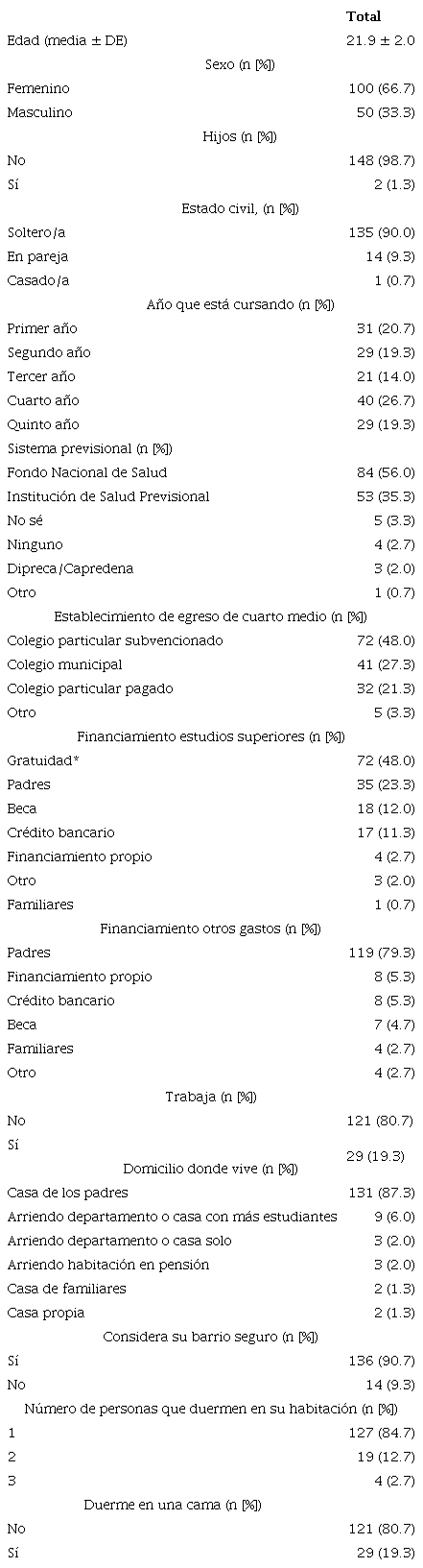Los participantes tuvieron una edad promedio de 21.9 años (DE = 2.0), en su mayoría eran mujeres (66.7 %; n = 100) y se encontraban cursando el cuarto año de la carrera (26.7 %; n = 40). En general, no tenían hijos (98.7 %; n = 148), eran solteros/as (90.0 %; n = 135) y estaban afiliadas/os al Fondo Nacional de Salud (Fonasa) (56.0 °%; n = 84). El 48.0 °% (n = 72) egresó de un colegio particular subvencionado y financiaba sus estudios mediante gratuidad universitaria. La mayoría no trabajaba (80.7 %; n = 121) y vivía en la casa de sus padres (87.3 %; n = 131), quienes financiaban el resto de sus gastos.