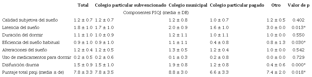 Al comparar según establecimiento de egreso de cuarto medio, los estudiantes egresados de colegios particulares pagados reportaron menores puntajes en los componentes "latencia del sueño", "eficiencia del sueño", "disfunción diurna" y puntaje total PSQI, al comparar con sus pares egresados de otros establecimientos (tabla 2).