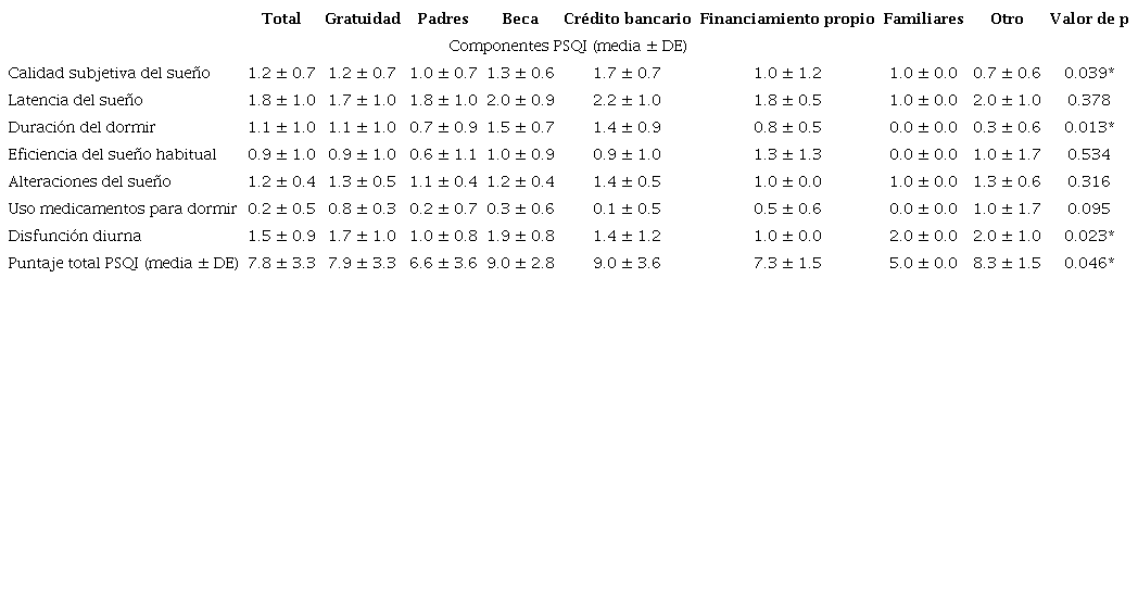 En cuanto al financiamiento de estudios superiores, se observaron peores puntajes totales de calidad del sueño y duración del dormir en participantes que financiaban sus estudios mediante becas o créditos bancarios (p = 0.046). Una posible explicación para este hallazgo sería la preocupación asociada a mantener el financiamiento de sus estudios: muchas becas requieren mantener alto rendimiento académico; mientras que los créditos bancarios requieren ser pagados a posterioridad, lo cual podría ser una fuente de preocupación para los estudiantes.