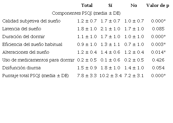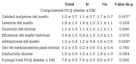 El promedio global del PSQI fue de 7.8 puntos (DE = 3.3). Al analizar por componentes, el puntaje promedio más bajo se observó en "uso de medicamentos para dormir"; mientras que el más alto fue "latencia del sueño". El 69.3 % (n = 104) de los participantes percibió su calidad de sueño como "buena" o "muy buena", en tanto el 72.0 % (n = 108) de los participantes obtuvo resultados globales categorizados como "mala calidad del sueño".