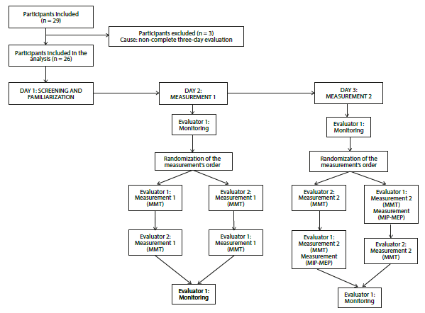 The protocol included measurements conducted over three days, spaced 2 and 8 days apart. On Day 0, screening and familiarization were carried out. During this session, anthropometric, spirometric, sociodemographic, disease-related, and monitoring-related variables were measured. Additionally, participants were familiarized with the muscle strength assessment process. On the second day, MMT was independently measured by two evaluators. On the third day, MMT was measured again by the same evaluators. One evaluator also measured Maximal Inspiratory and Expiratory Pressures (MIP and MEP) during these sessions. All variables were measured in a randomized order. Vital signs were monitored at the beginning and end of each session by one evaluator. Both evaluators were blinded to previous measurements and to each other's results. To ensure consistency, evaluations were conducted at the same time each day. Participants were instructed to continue their medical treatments throughout the study (Figure 1).