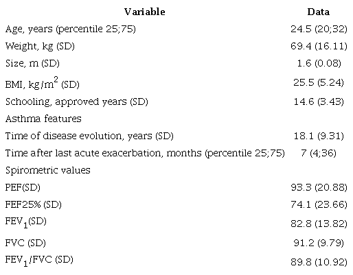 Subjects. The study included adults with asthma in stable phases of the disease, as defined by the Global Initiative for Asthma (GINA) criteria, which consider the control of signs and symptoms and functional test results 2. Patients were excluded if they had comorbidities such as heart disease, uncontrolled arterial hypertension, recent lung biopsy, spinal cord injury, ocular lesions, tracheotomy, upper airway surgery or trauma, hemodynamic instability, pregnancy, or respiratory infections 11. Additionally, patients with musculoskeletal or neurological sequelae compromising thoracic mobility and muscle control were excluded, as were those who demonstrated a lack of voluntary effort during spirometry 12, defined by a Peak Expiratory Flow (PEF) or Forced Expiratory Flow at 25 % (FEF25%) below 60% of the predicted value 13. Measurements were conducted in the Laboratory of Movement Analysis at the School of Physiotherapy, Universidad Industrial de Santander.