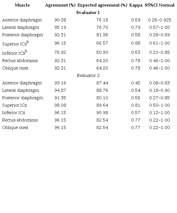 Reliability of MMT. Intrarater reliability was comparable for both evaluators. Agreement levels were substantial (kappa = 0.78-0.88) for the superior external intercostal and abdominal muscles, and moderate (kappa = 0.45-0.59) for the anterior and posterior diaphragm. Wide confidence intervals were observed for all evaluated muscle groups. These findings are detailed in Table 2.