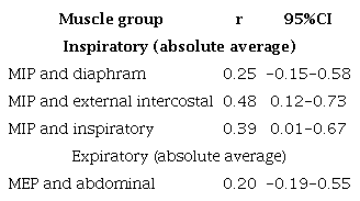 The convergent validity of MMT and static respiratory pressures was low. Correlation analysis was performed between MIP and the average score of diaphragms and external intercostal muscles, as well as between MEP and the average score of abdominal muscles. However, the analysis was not performed specifically for each subgroup of muscles, as respiratory pressures do not differentiate strength by muscle group 19. For this reason, and for the reasons discussed below, MIP and MEP may not serve as the best comparison standards.
