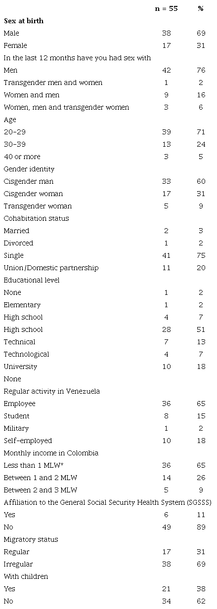 Resultados: Foram entrevistados 55 trabalhadoras e trabalhadores sexuais em Bogotá D.C., na Área Metropolitana do Valle de Aburrá e no Eje Cafetero colombiano. O 69 % eram homens ao nascer e 31 % eram mulheres. Em termos de identidade de gênero, 60 % se identificaram como homens cisgêneros; 31 %, como mulheres cisgêneros, e os 9 % restantes, como mulheres transgêneros. A idade média dos participantes foi de 27 anos. Quanto ao status migratório, 69 % dos profissionais do sexo entrevistados estavam no país ilegalmente.