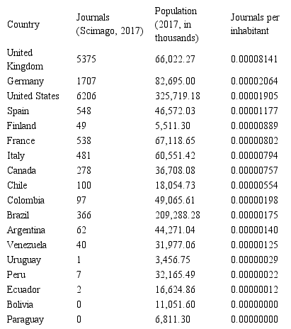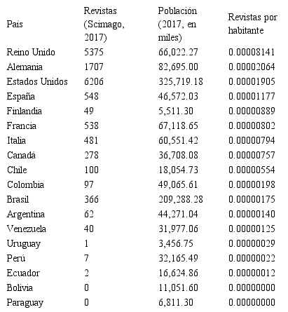 En el mismo marco, el número de revistas por habitante de los países de América del Norte y de Europa Occidental es más alto en relación con los países de América del Sur. Por ejemplo, el número de las revistas de Reino Unido por habitante es casi 15 veces más grande que el número de las revistas científicas de Chile (Papapostolou, Papapostoulou y Stefos, 2013), citados por (Castellano, Stefos, Sánchez, Torres y Reiban, 2018b).