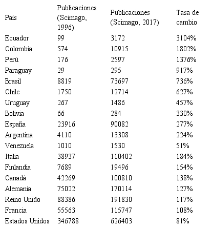 The aim of this study was to present the results of research published in scientific journals from South American countries, comparing them with published research results from North American and Western European countries using the Scimago database. Information from the years 1996 and 2017 was used; the exchange rate by country, publications per inhabitant in each country, and the number of scientific journals per country in relation to their population were calculated (Papapostolou and Stefos, 2013), cited by (Castellano, Stefos, Sánchez, Torres and Reiban, 2018a).
