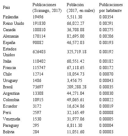 En la Tabla 2 y el Gráfico 2 se presentan las publicaciones por país en revistas científicas de la base Scimago en relación con la población de dichos países durante el año 2017. De los países de América del Sur, el país que más publicaciones por habitante tiene es Chile (0.00070) y siguen: Uruguay (0.00043), Brasil (0.00035), Argentina (0.00030), Colombia (0.00022), Ecuador (0.00019), Perú (0.00008), Venezuela (0.00005), Paraguay (0.00004) y Bolivia (0.00003).