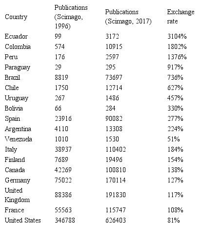 The improvement that occurs in the exchange rate of the countries of South America, means a very important progress in the scientific and research production of these countries published in scientific journals of Scimago.