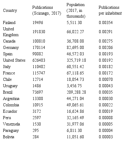 Table 2 and Graph 2 show the publications by country in scientific journals of the Scimago database in relation to the population of those countries during the year 2017. Of the countries of South America, the country with the most publications per inhabitant has is Chile (0.00070) and continues: Uruguay (0.00043), Brazil (0.00035), Argentina (0.00030), Colombia (0.00022), Ecuador (0.00019), Peru (0.00008), Venezuela (0.00005), Paraguay (0.00004) and Bolivia (0.00003).