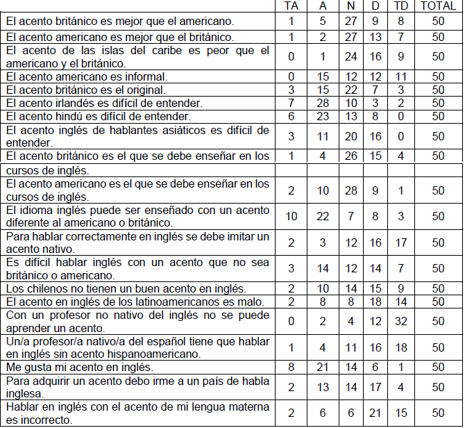 En lo que respecta a la selección de un acento en la enseñanza del idioma inglés, la mayoría mostró una postura neutral de valoración del acento americano y británico. Igualmente, se pudo observar que la mayoría está de acuerdo que el idioma inglés puede ser enseñado con acentos distintos al americano o británico. La mayoría no estuvo de acuerdo en que hablar correctamente en inglés requiera la imitación del acento de un hablante nativo. Igualmente, se observa que la mayoría considera que no es difícil hablar en inglés con un acento distinto al británico o americano. En cuanto a la calidad del acento en inglés de los chilenos y latinoamericanos la mayoría mostró estar en desacuerdo que este sea malo.